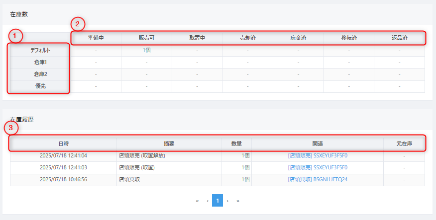 2 | 在庫ステータス | 準備中:品出し前の状態 販売可:品出し後の販売可能な状態 取置中:EC・販売などで取置中の状態 売却済:販売確定後の状態 廃棄済:廃棄処理後の状態 移転済:他店舗へ店間移動後の状態 返品済:買取・仕入における返品確定後の状態 在庫(販売可):販売可のみ 在庫(その他):準備中と取置中 |