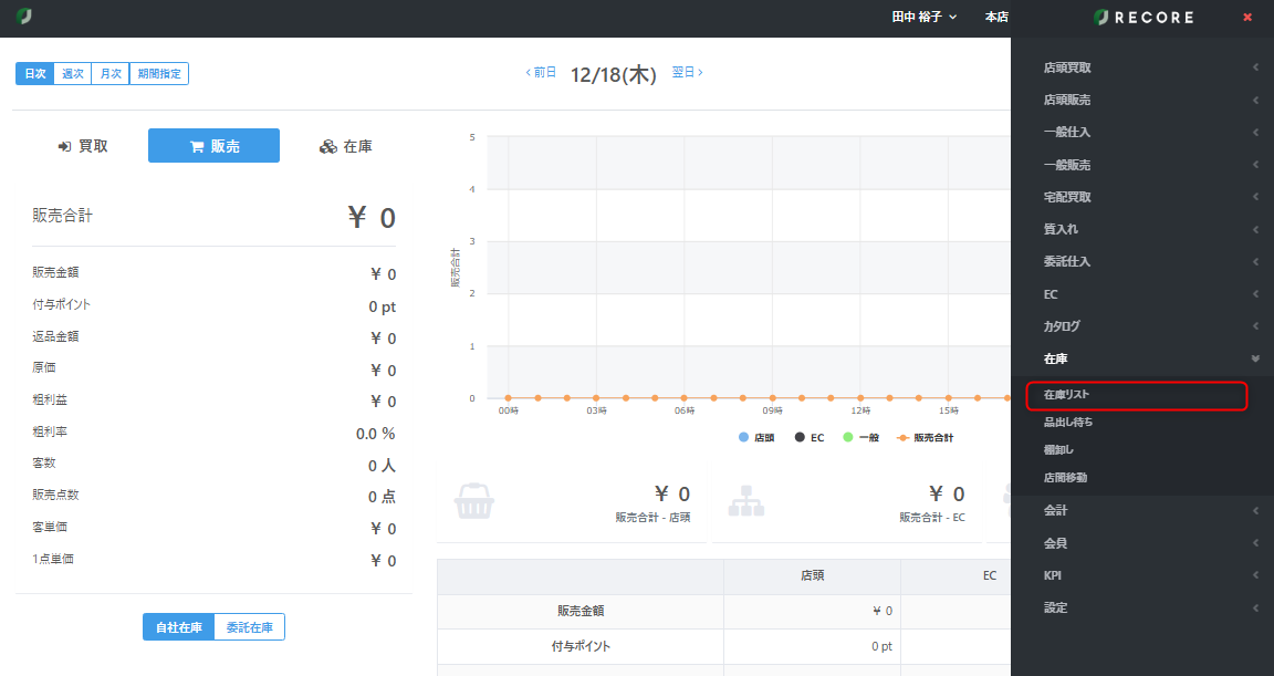 在庫は、【在庫】メニューの【在庫リスト】より確認が可能です。