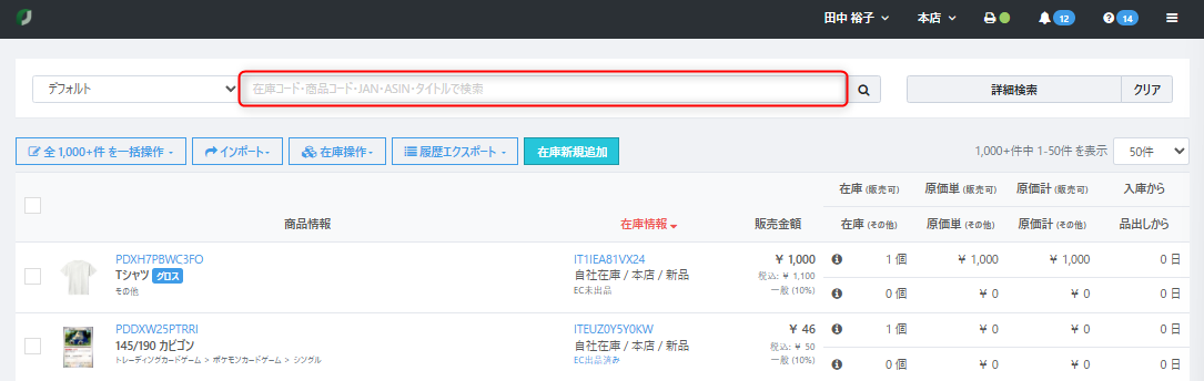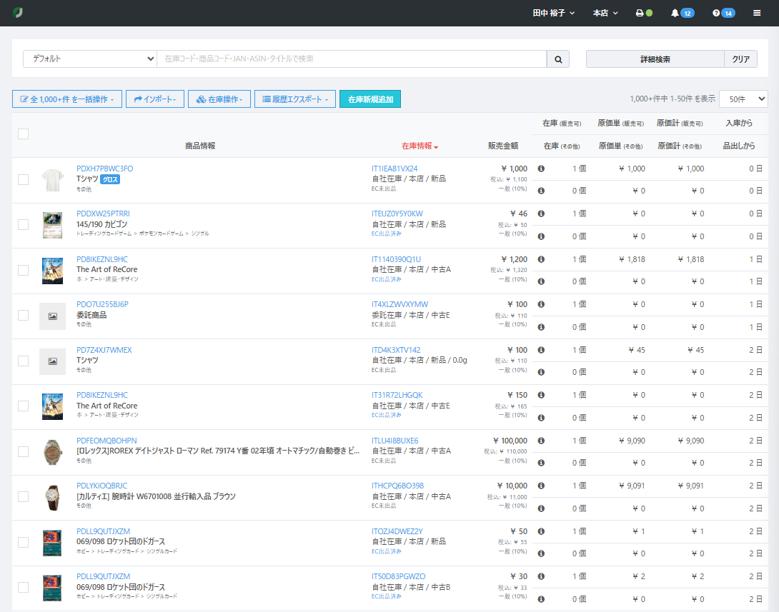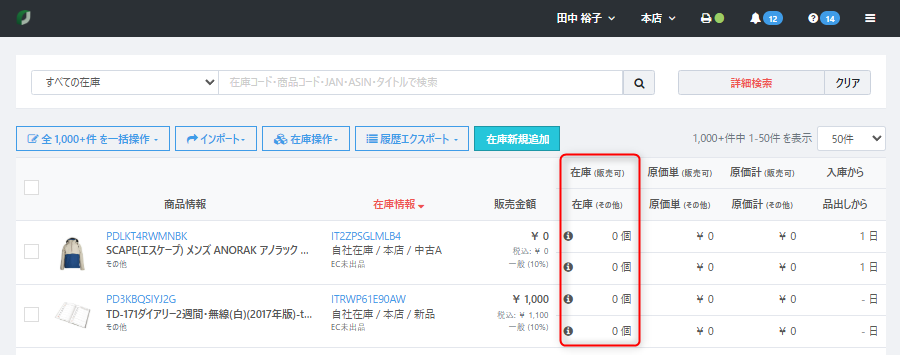 各在庫には、適用しているカタログの商品情報、在庫情報、販売金額、在庫の数量・原価などの情報が一覧として表示されます。