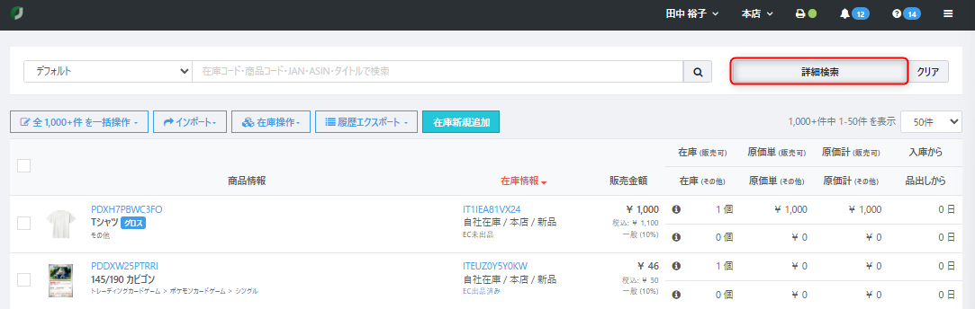 カテゴリ、販売金額、在庫種別、販売金額、在庫数、在庫属性、商品属性など複数の条件により絞り込みすることが可能です。