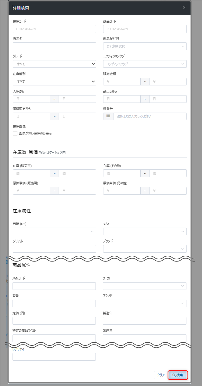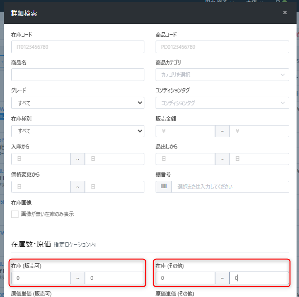 2 | 在庫種別 | 在庫を以下のいずれかの種別で表示 自社在庫:自社で保有する在庫(買取・仕入・質流により入庫した在庫) 委託在庫:委託先の在庫(委託仕入より入庫した在庫) |