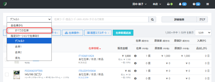 【在庫リスト】画面左側の『デフォルト』をクリックし、『すべての在庫』に変更します。