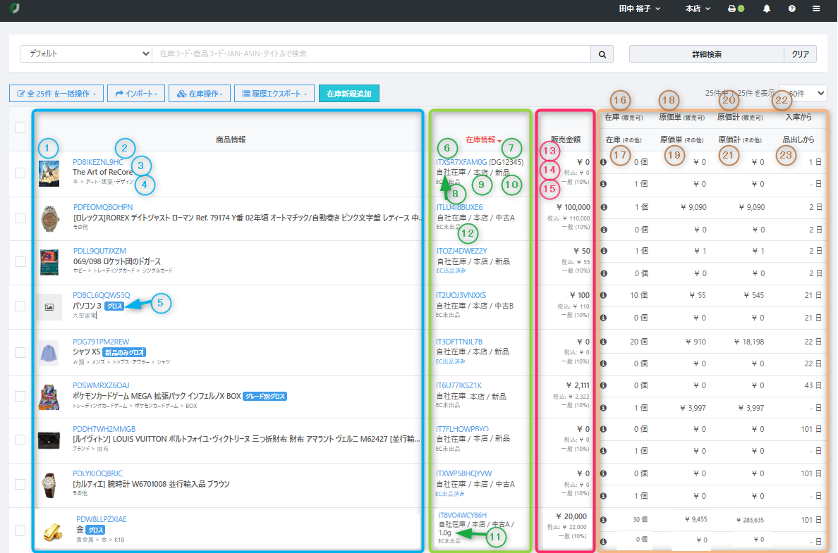 在庫リスト画面の表示内容について解説します。