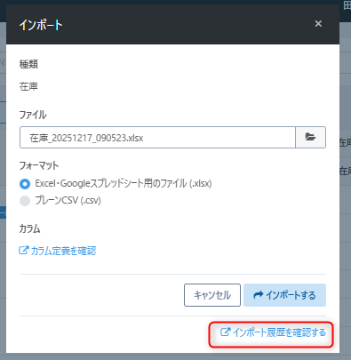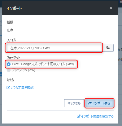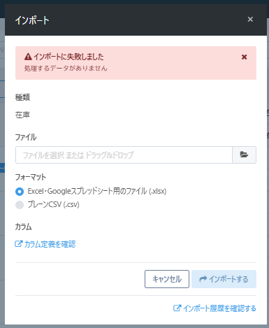 ・インポートを行う前に必ず現在の在庫データをエクスポートし、バックアップとして保存してください。