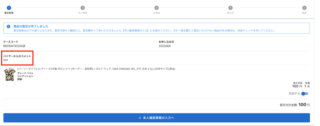 以上の流れにより、遷移した画面上から査定結果とともにバイヤーコメントを確認することが可能となります。(例2参照)