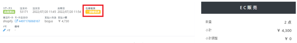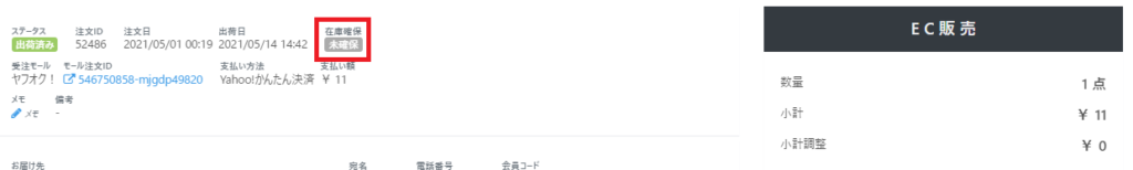 また、RECOREの【EC>受注管理】画面より「注文詳細を確認」から『在庫確保』の項目で「未確保」となっている場合は空売りに該当する可能性があります。