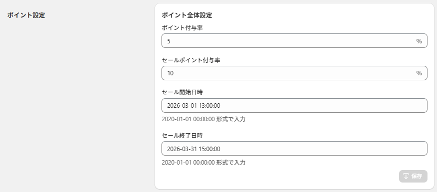 セールの開始日時を設定する。期間内は自動でセールポイント付与率が反映