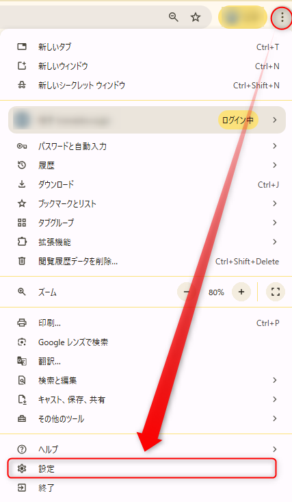 ➌GoogleChrome画面の右上にあるメニュー3つの点をクリック後に「設定」をクリック