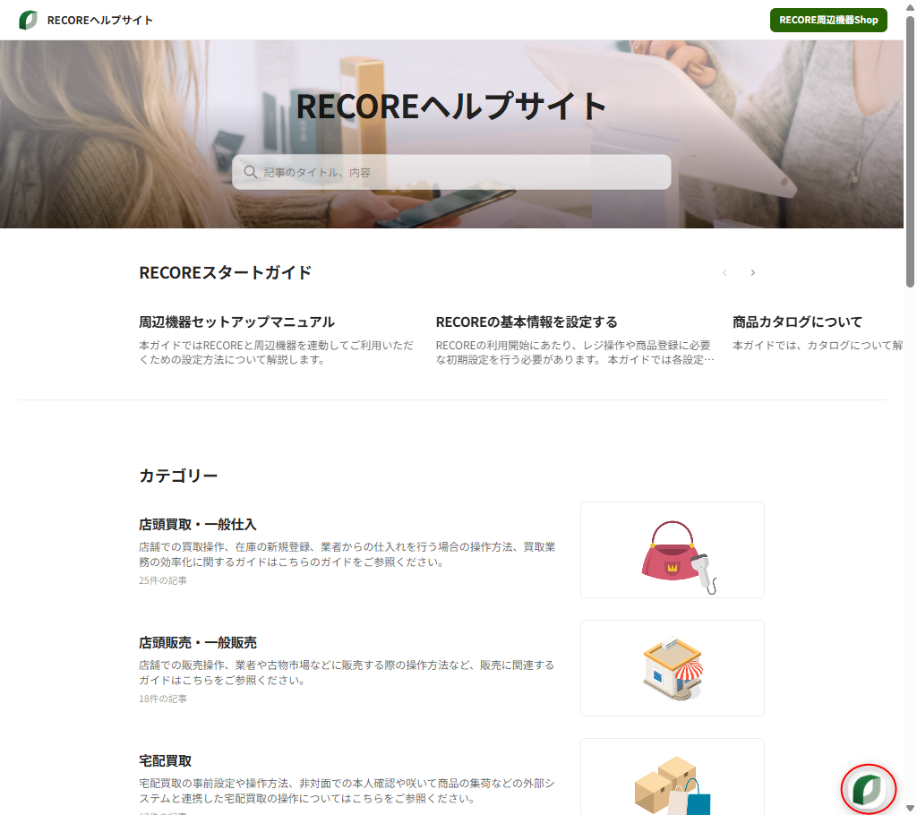 お手数ではございますが、以下URLをクリックしてRECOREのヘルプサイトのTOP画面にアクセスしてください。