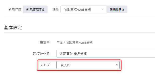 ①【宅配買取】のメッセージテンプレート作成後、『スコープ』の項目を変更し保存します。