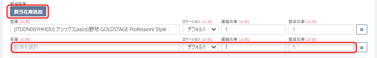 ④セットにして販売したい商品を【割当在庫追加】ボタンをクリックして、セット元となる商品を全て指定します。