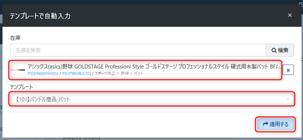 ③【テンプレートで自動入力】画面において、以下を指定のうえ【適用する】ボタンをクリックします。