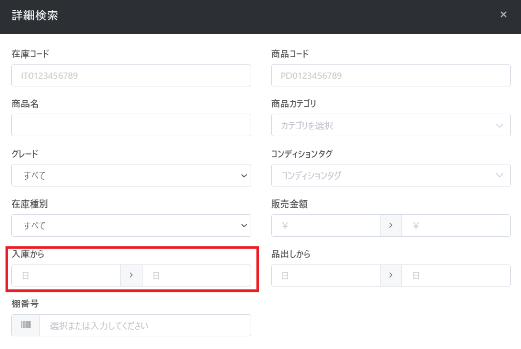 【在庫リスト】画面の【詳細検索】をクリック後、【入庫から】の項目に経過日数を入力して【検索】ボタンをクリックすることで対象の在庫を確認することが可能です。