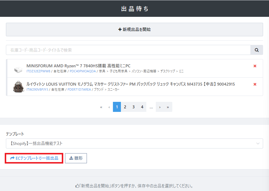 EC一括出品機能は1つのEC出品テンプレートを選択し、複数の商品を一括で出品できる機能となります。