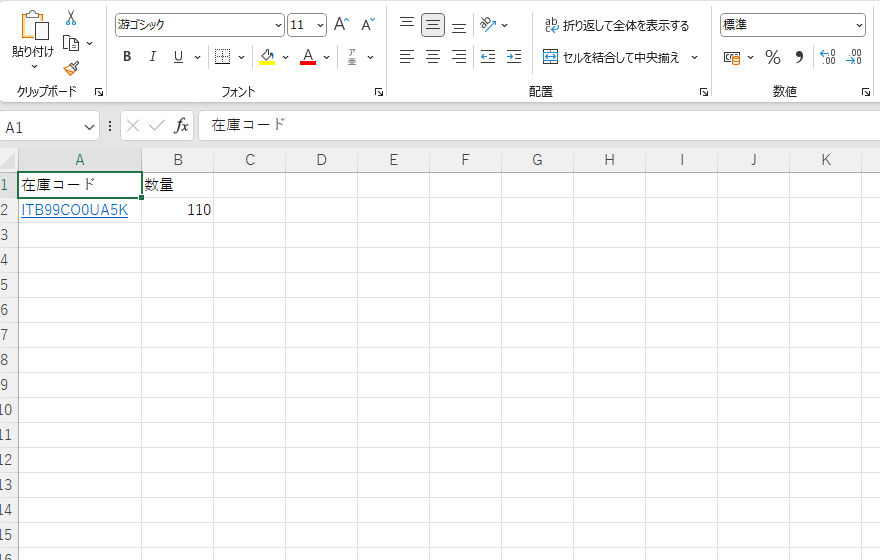 ③分割元(もしくは結合元、振替元)CSVファイルに、元となる【在庫コード(IT)】と【数量】を入力します。