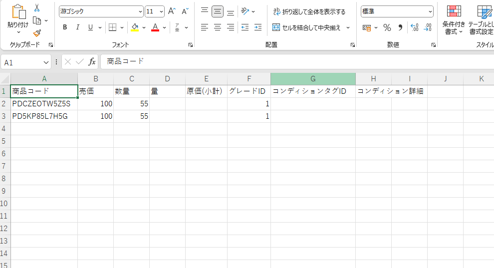 ⑥分割先CSVには、分割先の【商品コード(PD)】、【売値】、【数量】、【原価(小計)】、【グレードID】、【コンディションタグID】、【コンディション詳細】を入力します。