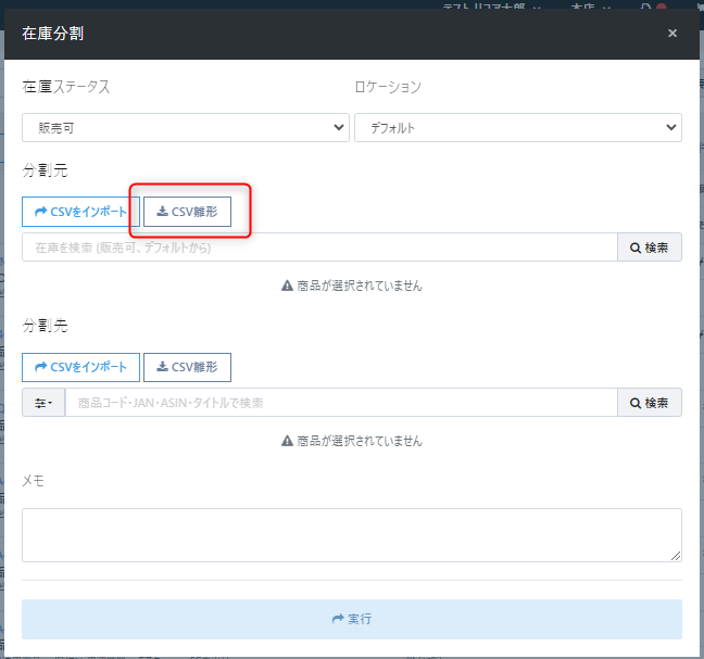 ⑤分割先も同じく【CSV雛形】をクリックし、分割先CSVをダウンロードします。