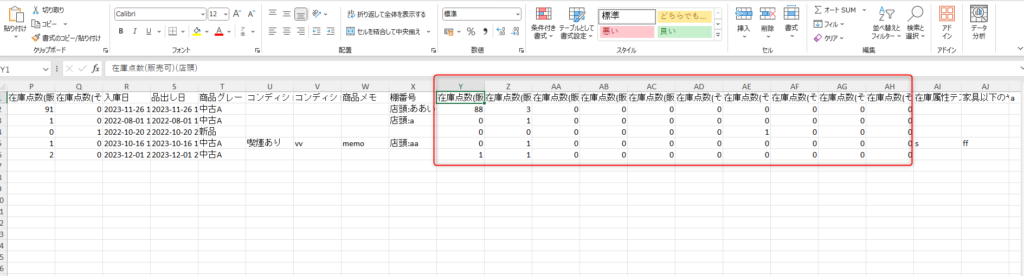店舗名/商品コード/在庫コード/代替在庫コード/商品名/在庫種別/カテゴリ(第1階層)/カテゴリ(第2階層)/カテゴリ(第3階層)/カテゴリ(第4階層)/カテゴリ(第5階層)/グロス管理/販売金額/原価(販売可)/原価(その他)/在庫点数(販売可)/在庫点数(その他)/入庫日/品出し日/商品グレード/コンディションタグ/コンディション詳細/商品メモ/棚番号/「設定」の「在庫属性設定」「商品属性設定」に設定の項目