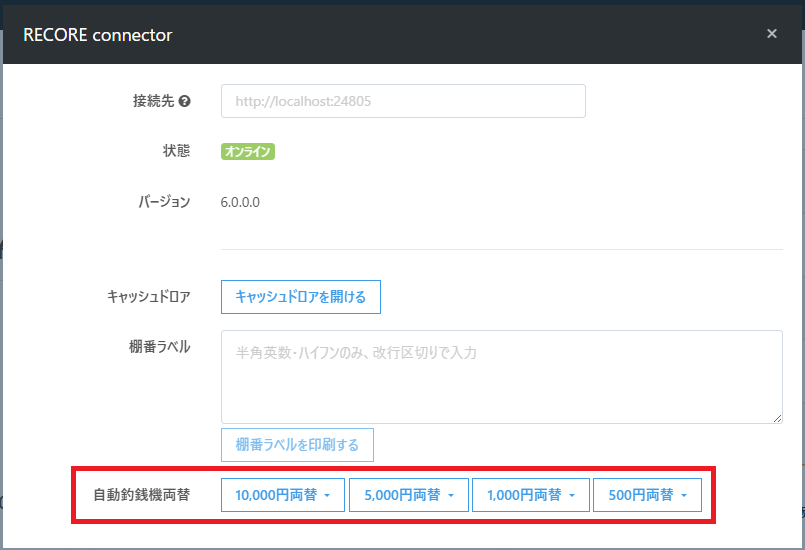 RECOREの【レジ入出金】機能を使い自動釣銭機の両替を行うことが可能です。
