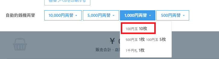 今回は1,000円札を100円玉10枚に両替するため、『1,000円両替』をクリックします。