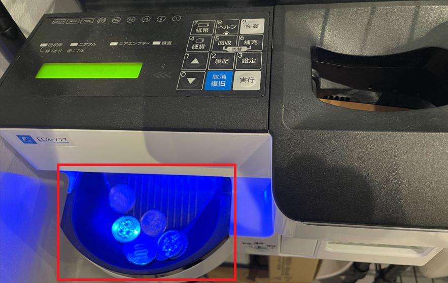 選択すると、自動釣銭機側が青く点滅し、入金待機中の状態となります。