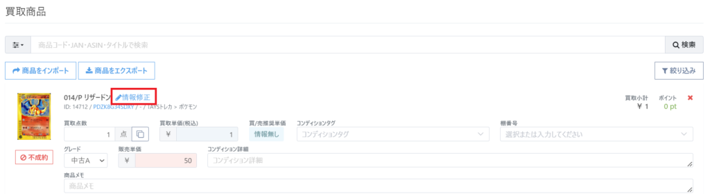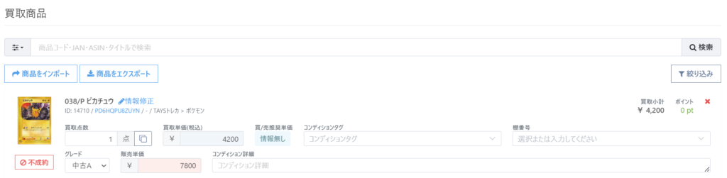 ⑧登録商品が表示されますので、必要に応じて商品情報の修正、入力を行い買取を確定してください。