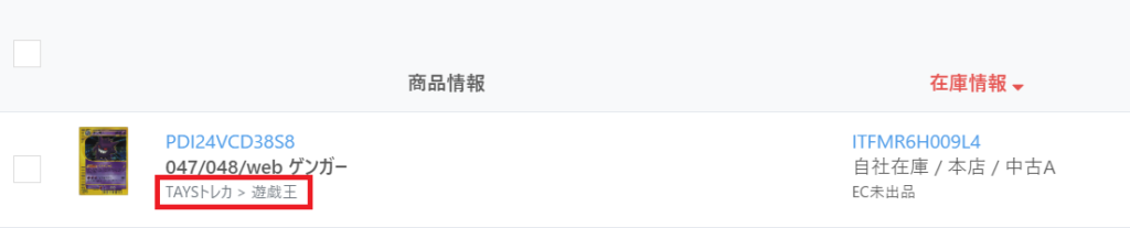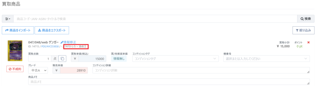 過去に買取を行ったカードを例えば誤って「TAYSトレカ>遊戯王」で登録していたとします。