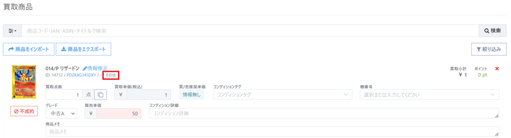・RECOREに登録していない新規商品を買い取る場合、カテゴリは「その他」になる