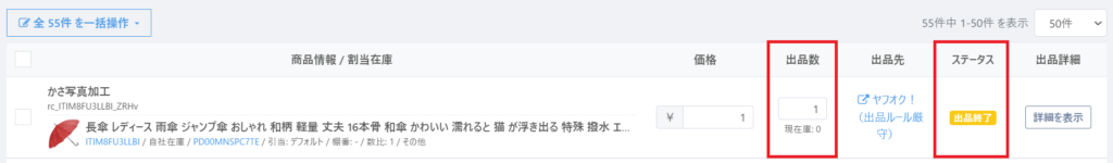 ①該当の在庫を【店頭販売】で販売後、以下のように「現在庫0」「出品数1」「出品終了」のステータスとなります。