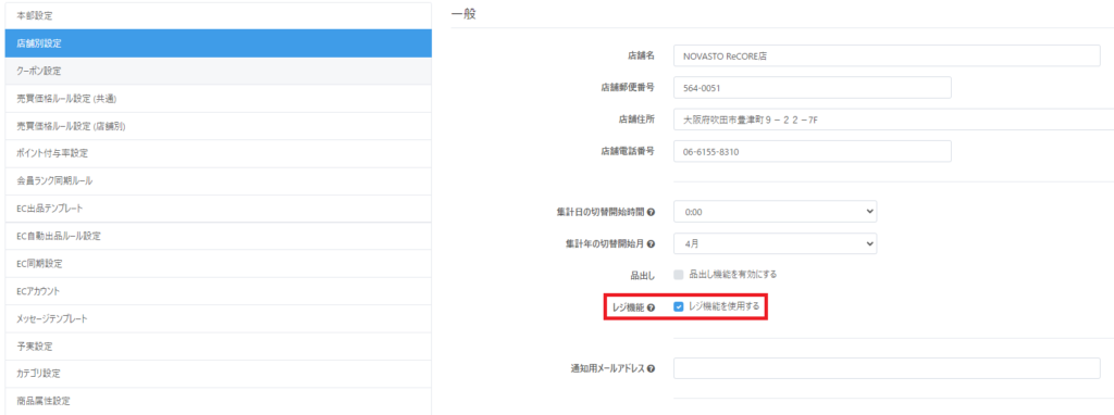 ReCOREの【設定>店舗別設定】にて「レジ機能を利用する」にチェックが付いている場合、以下の項目が設定できているかを確認します。