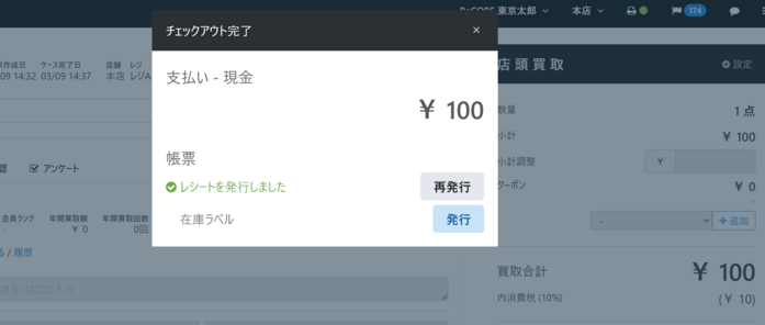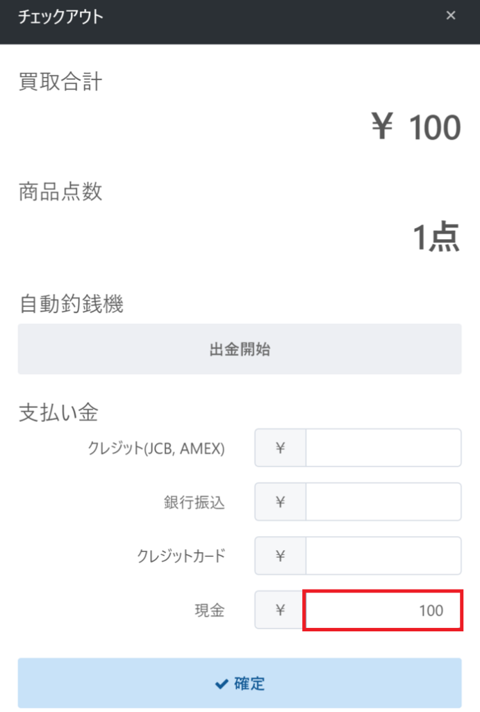 ③表示された段階ではチェックアウト画面の「現金」の項目が空白となっていますので、買取金額を手動で入力し確定します。