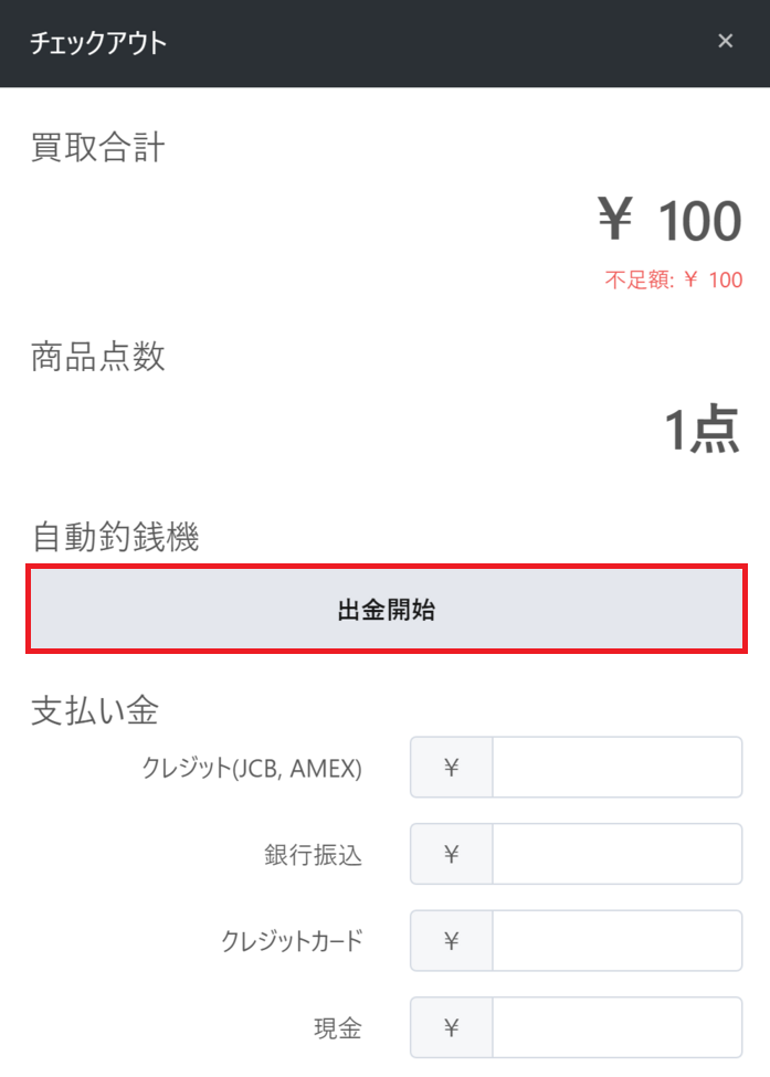 ①買取を行い買取金額を釣銭機から出金するため「出金開始」ボタンをクリックします。