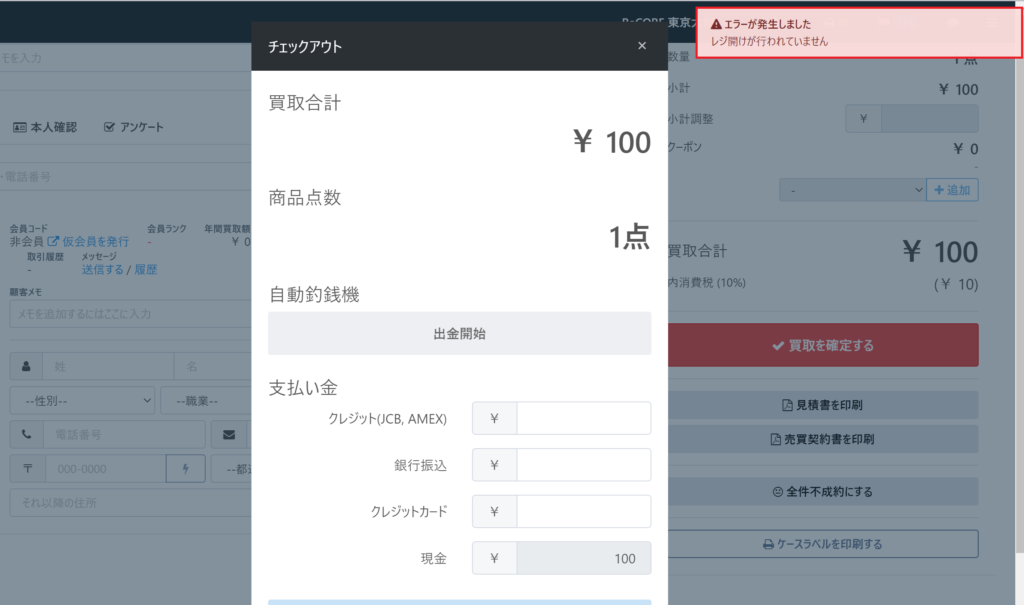 ReCOREではレジ機能を利用するにチェックが入っている状態でレジ開けを忘れた場合、買取および販売を確定することができない仕様です。
