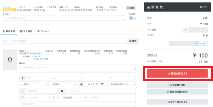 ②レジ開け完了後、エラーが発生した買取ケースに戻り「買取を確定する」をクリックします。