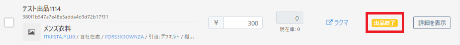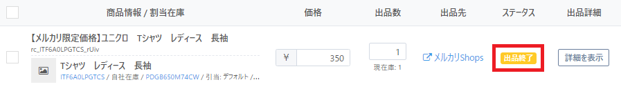 また在庫が無くなった場合でもステータスは自動では「出品終了」にはなりません。