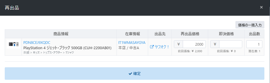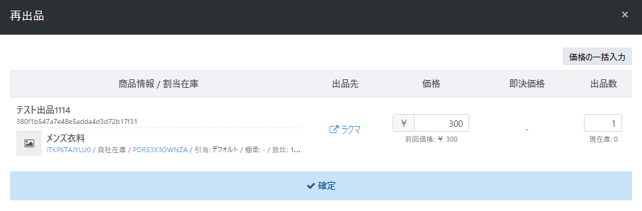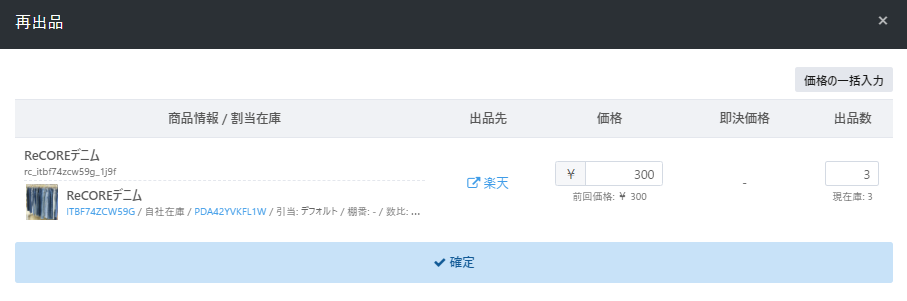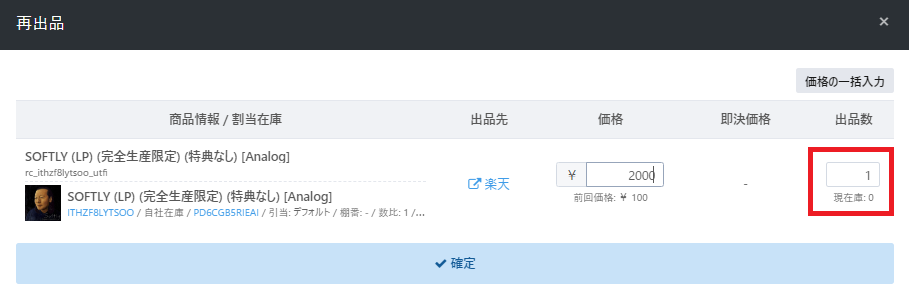 再出品のモーダルが起動しますので、再出品の価格と出品数を入力し「確定」をクリックして再出品の完了です。