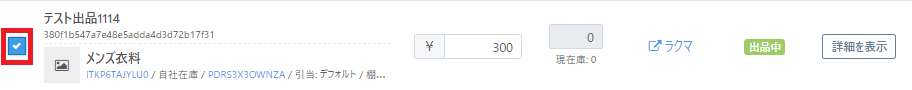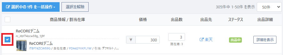 ReCOREの【出品リスト】より再出品を行う商品に対してチェックを付けます。