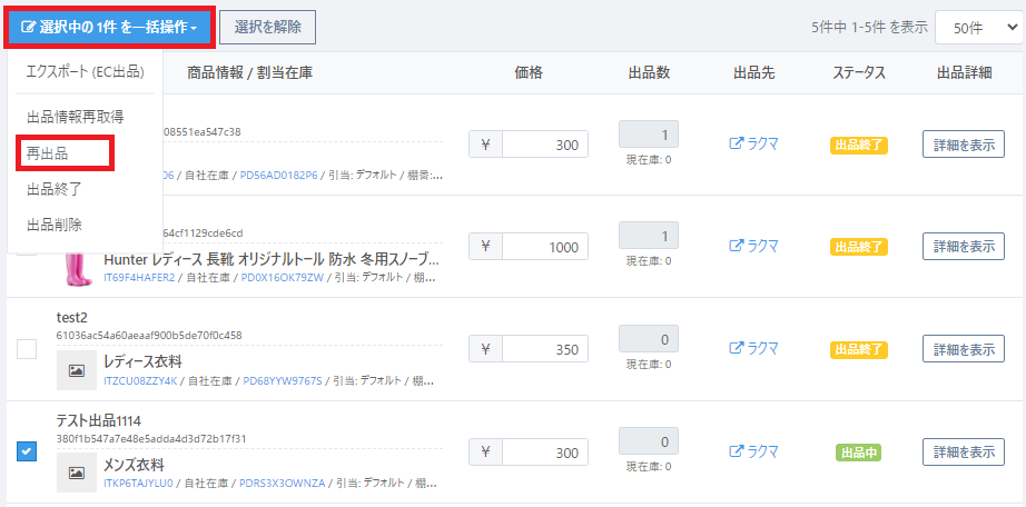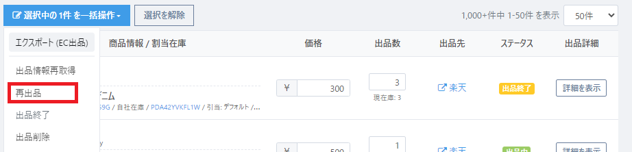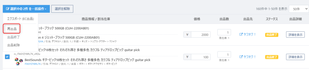 再度、再出品を行う出品に対してチェックを付け「選択中の〇件を一括操作」をクリックし、表示された選択肢から「再出品」をクリックします。