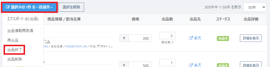 「選択中の〇件を一括操作」をクリックし、表示された選択肢から「出品終了」をクリックするとステータスが「出品終了」となります。