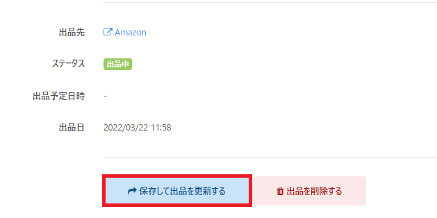 ・【出品リスト】より「詳細を表示」から出品情報を編集後「保存して出品を更新する」をクリック