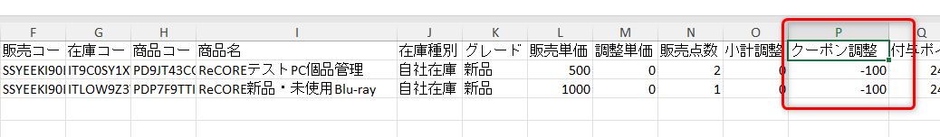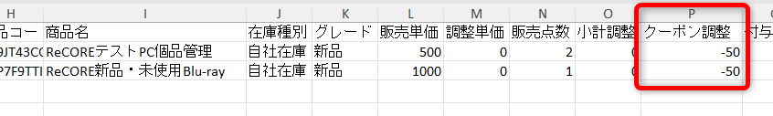 その際、店頭販売のケース詳細データでは「クーポン調整」列に表示される金額を参照ください。
