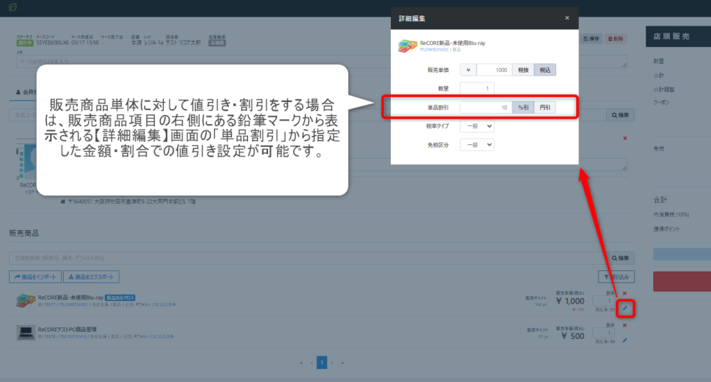 販売商品単体に対して値引き・割引きをする場合は、【販売商品】項のの右側の鉛筆アイコンをクリックし、表示される詳細編集画面の「単品値引」項から調整を行ってください。