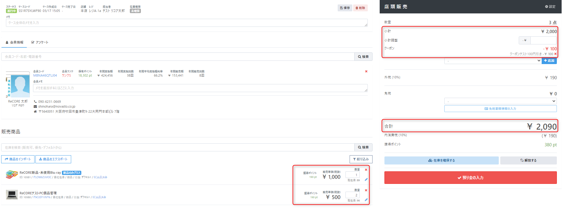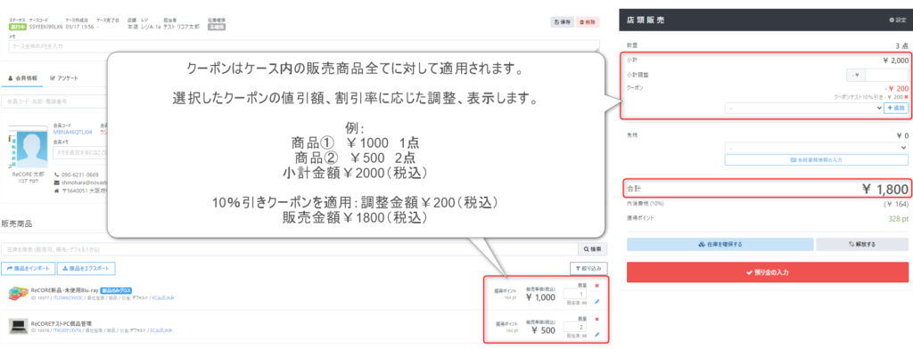 ReCORE【設定】>【クーポン設定】にて登録したクーポンを店頭販売にて適用可能です。