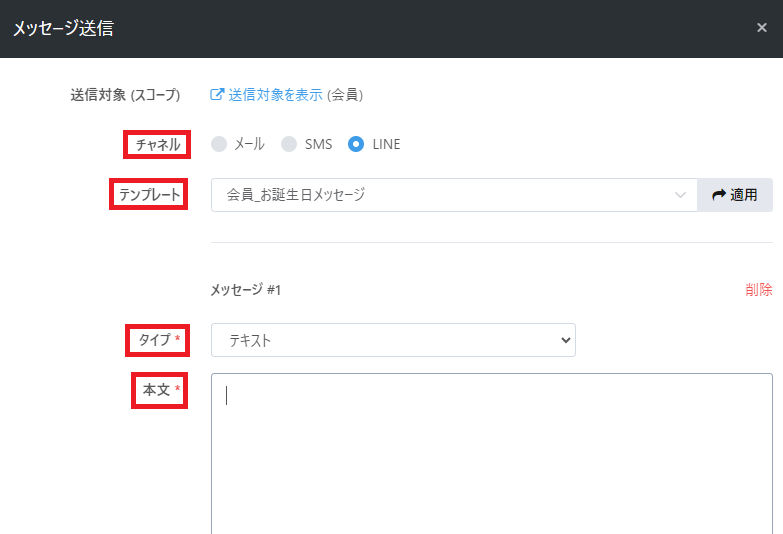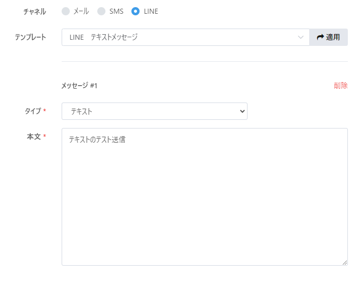 ※事前に作成済みのメッセージテンプレートを適用された場合はメッセージタイプの選択と本文の入力は不要です