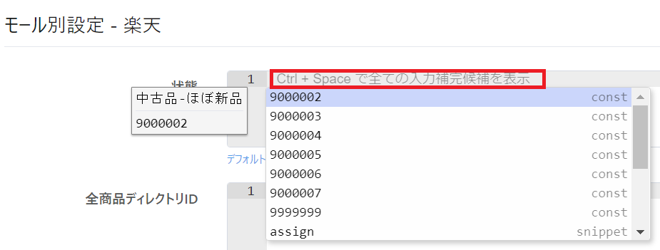なお、EC出品テンプレートのliquid入力欄にて「Ctrl + Space」を入力することで入力の補完機能をご利用いただけますので参考情報としてご活用ください。