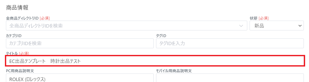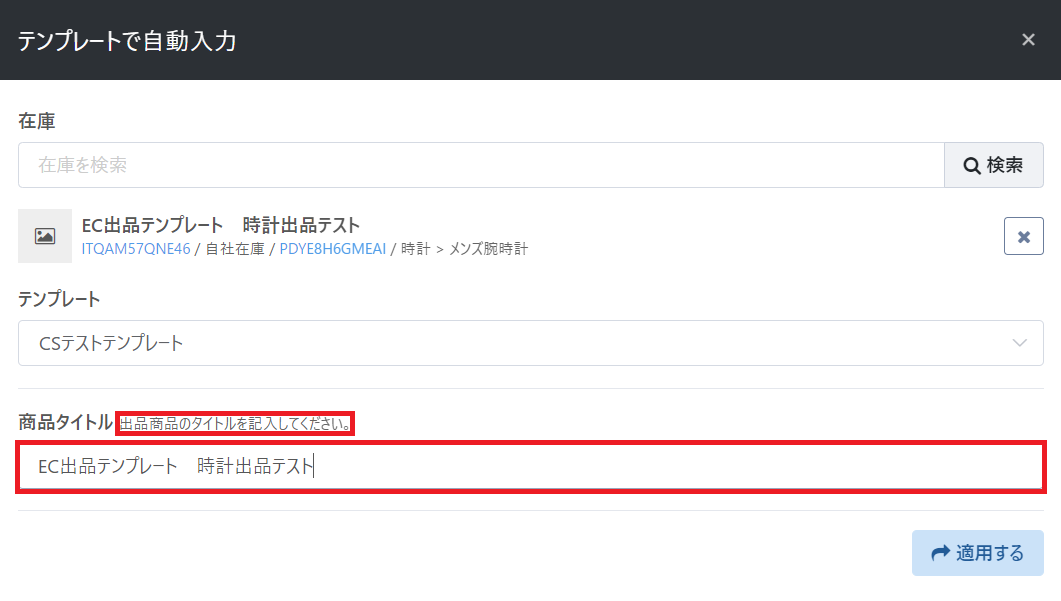 これにより、例えば入欄設定にてラベル名を「タイトル」とし、「初期値」の項目に{{product.title}}をご入力いただくことで、EC出品テンプレートが選択されたタイミングで出品商品に紐づくカタログの商品名が表示されます。