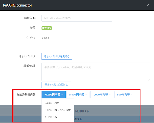 今回のリリースにより、ReCOREコネクターのメニュー内に自動釣銭機を使用した両替機能を追加いたしました。