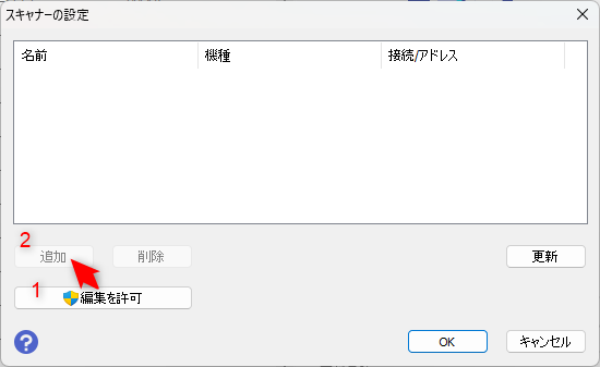 ②表示される「スキャナーの設定」画面では画面下部の【編集を許可】を実行し、上部の【追加】ボタンをクリックします。