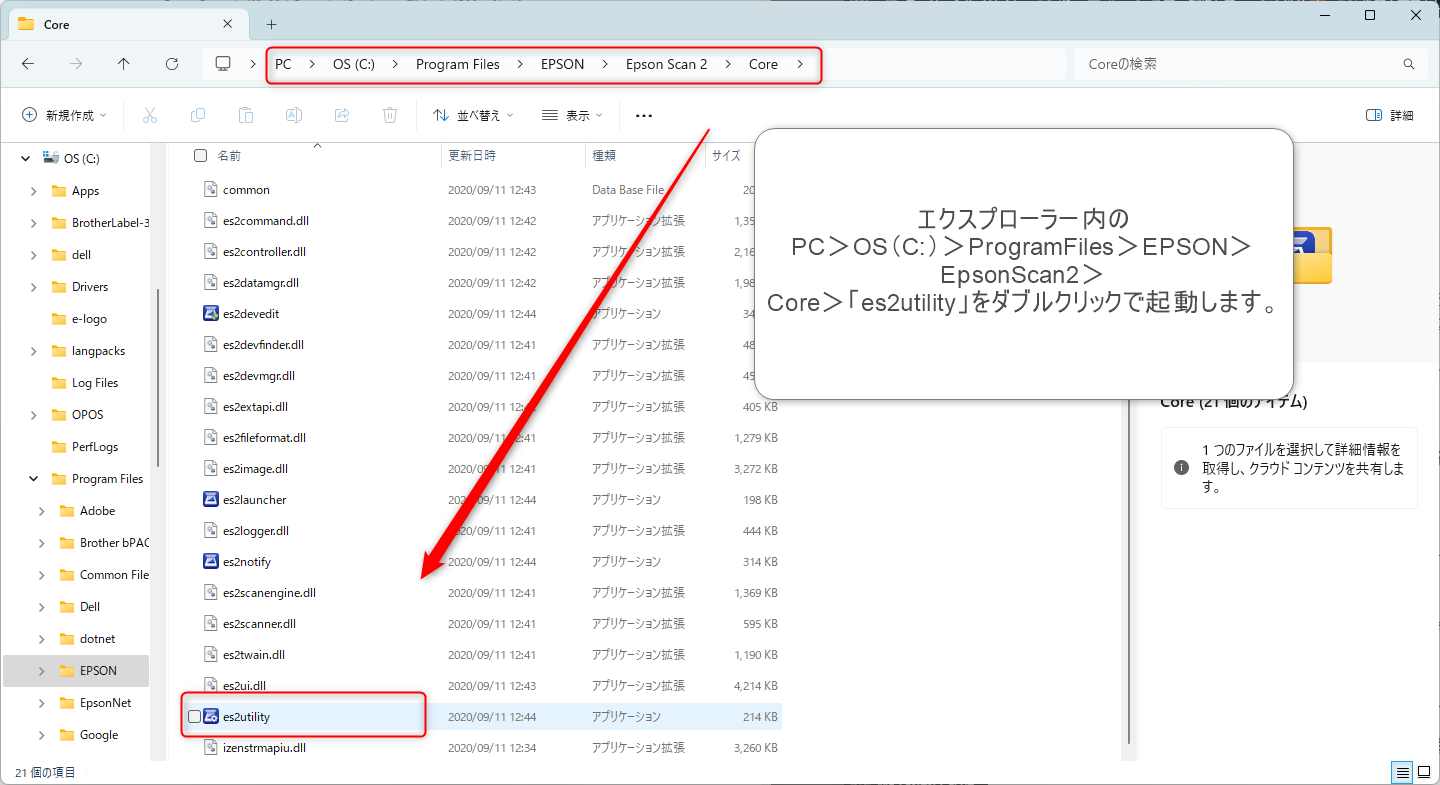 ①エクスプローラー内の PC>OS(C:)>ProgramFiles>EPSON>EpsonScan2> Core>「es2utility」をダブルクリックで起動します。