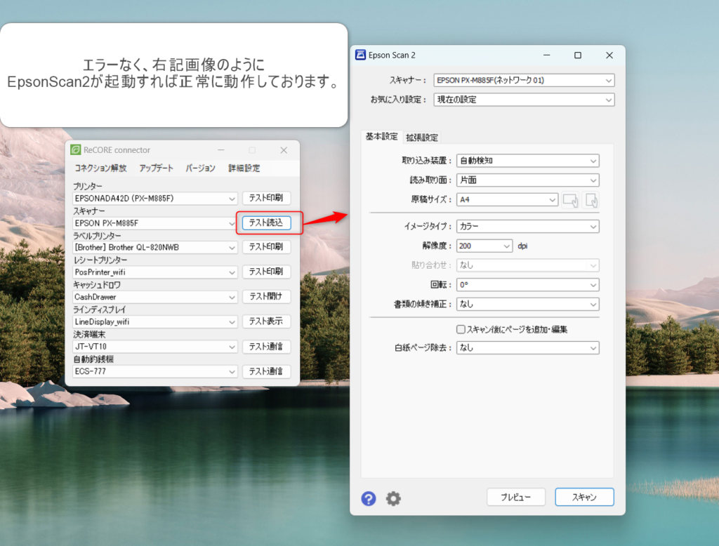 ⑥ReCOREコネクターを再起動し、「スキャナー」項目でご利用の複合機を選択のうえ【テスト読込】をクリックします。 以下画像のようにEpsonScan2が起動すればエラー解消となります。